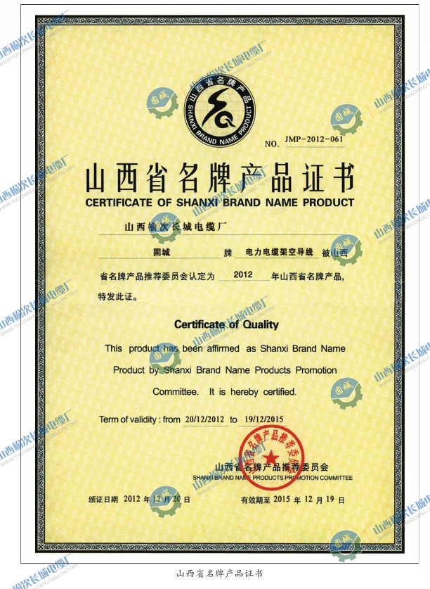山西省名牌產品證書